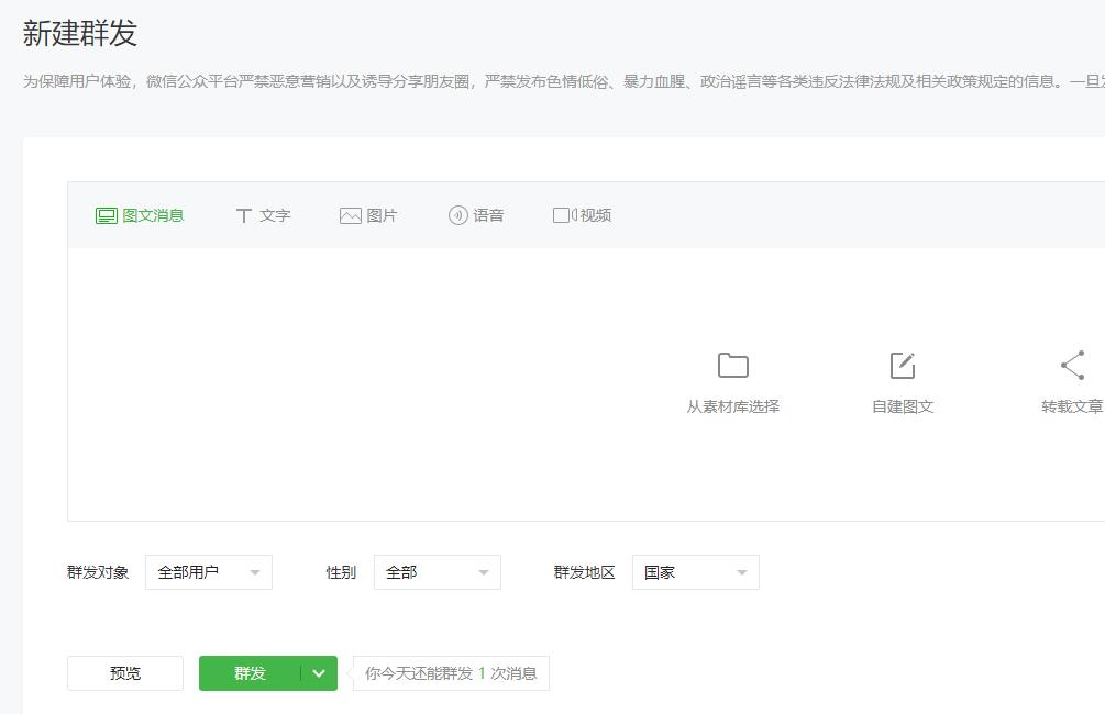 在公眾號(hào)首頁(yè)找到 新建群發(fā) 你要推送的消息可以是 圖文 圖片 音頻 視頻 根據(jù)需求推送