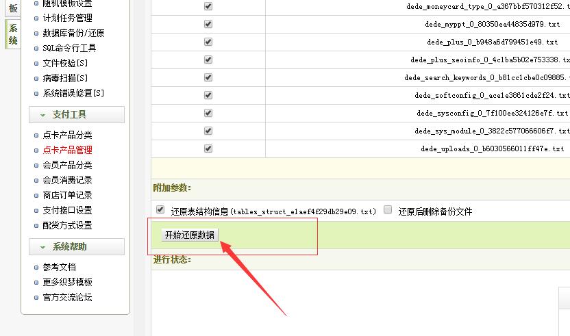 2.安裝好后,在后臺(tái)“系統(tǒng)”—“數(shù)據(jù)庫備份/恢復(fù)”,點(diǎn)右上角“還原數(shù)據(jù)”—“開始還原數(shù)據(jù)”,恢復(fù)數(shù)據(jù)庫。
