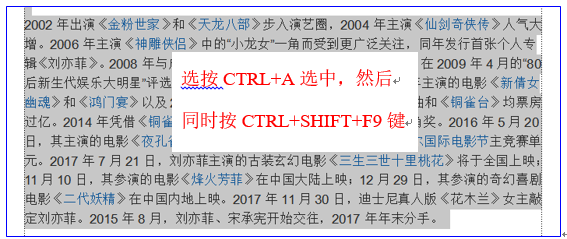大家看到這些藍(lán)色的超鏈接文字看著十分的醒目,讓人一看就知道這些文字是比網(wǎng)上下載的,看上去效果也不是太好,這個(gè)時(shí)候,我們只需按CTRL+A鍵選中所有的內(nèi)容,然后同時(shí)按CTRL+SHIFT+F9鍵,如圖: