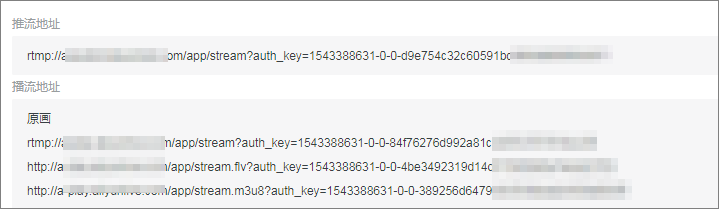 以推流地址rtmp://push.aliyunlive.com/app/stream?auth_key=1543302081-0-0-9c6e7c8190c10bdfb3c0************為例,