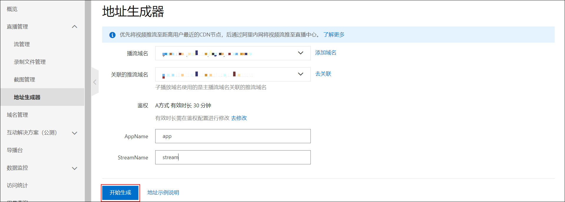 單擊 直播管理>地址生成器。